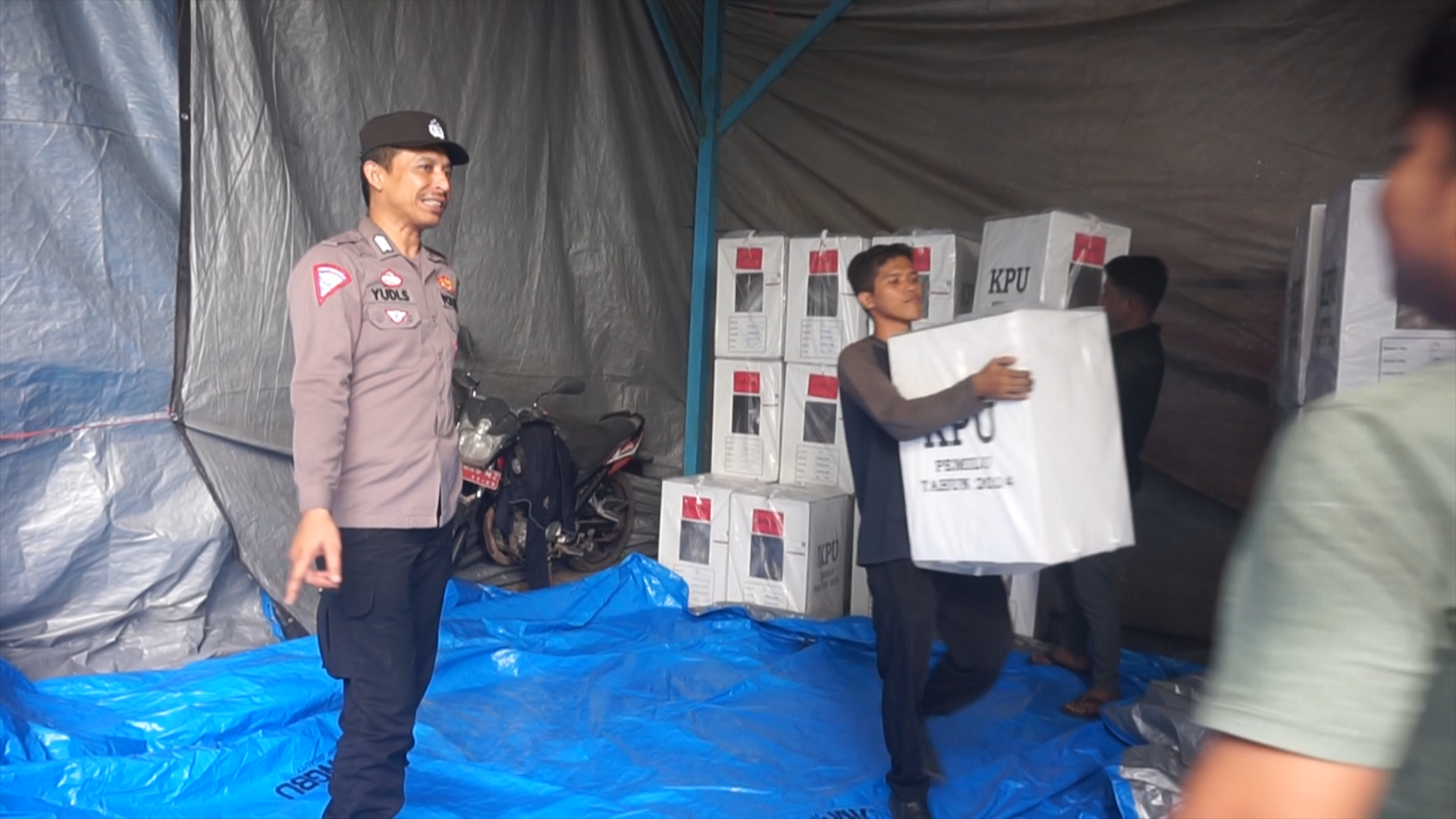 “Gudang ini sementara karena besok semua kotak suara sudah berada di kelurahan, jadi ini sementara aja,” kata Joshua.