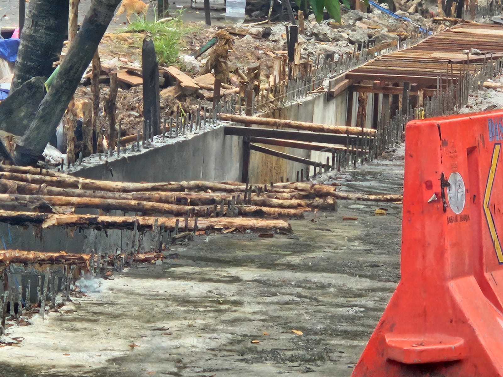 Ketiga, yang sangat mengerikan adanya pemasangan besi struktur dinding drainase yang dibiarkan ujungnya tetap terbuka. Padahal ujungnya tajam-tajam. Kondisi seperti ini bisa kita lihat di ruas pekerjaan drainase di depan lapangan kuliner. Kira-kira sepanjang 50 sampai 100 meter. Pemandangan itu sudah berbulan-bulan.