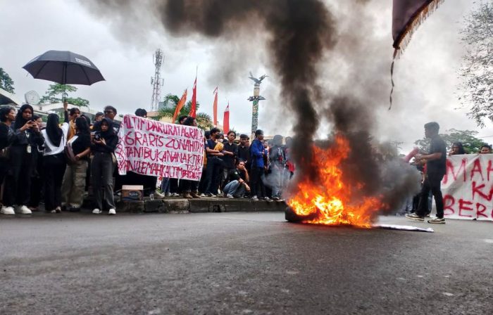 Dalam aksi ini, beberapa mahasiswa tampak membakar poster sebagai bentuk kritik terhadap pemerintahan saat ini.