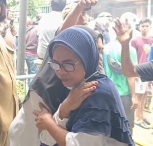 Seorang warga tidak kuasa menahan kesedihan saat melihat tempat tinggalnya  terbakar hangus dilalap si jago merah,  ia hanya bisa pasrah, air mata terus mengalir bahkan terlihat sedikit panik saat mengabarkan kejadian kebakaran yang menimpanya kepada kerabatnya,  hingga akhirnya warga tersebut harus ditenangkan oleh warga sekitar dan dibawa masuk kerumah warga lainnya untuk beristirahat.
