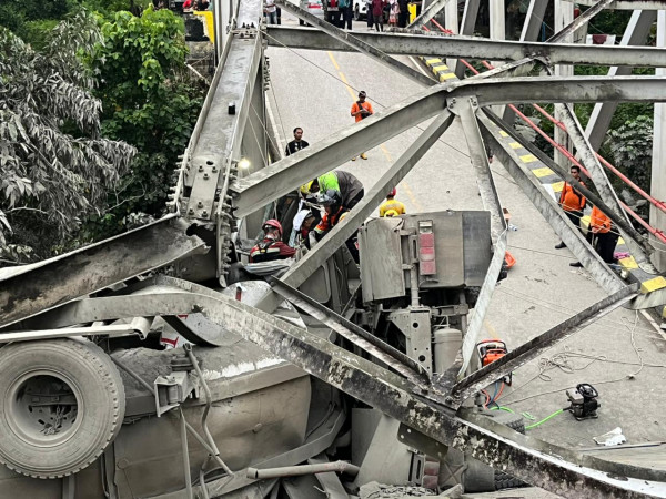 Hingga saat ini aparat kepolisian bersama Badan Penyelamatan Bencana Daerah (BPBD), pemadam kebakaran, Satpol PP juga sasyarakat sekitar masih melakukan evakuasi terhadap kernet dan sopir yang terjebak didalam kabin truk.
