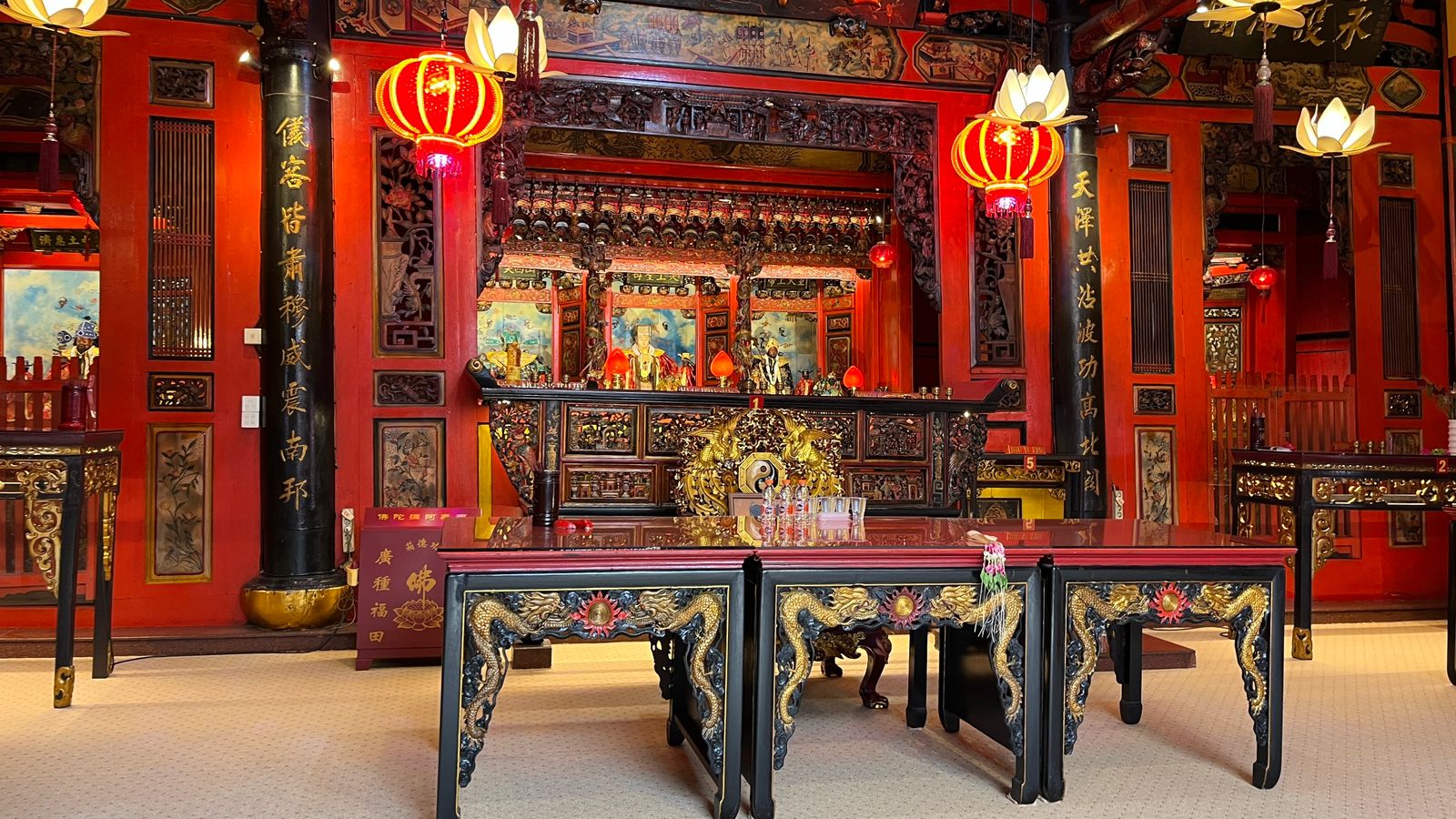Di antara dekorasi khas yang menghiasi kelenteng adalah lampion merah yang melambangkan keberuntungan, serta bunga sakura dan tulisan Mandarin yang memperkaya suasana.